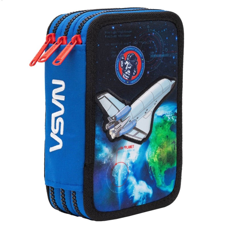 Piórnik potrójny marki Coolpack z wypukłym wizerunkiem promu kosmicznego oraz kompletnym wyposażeniem.